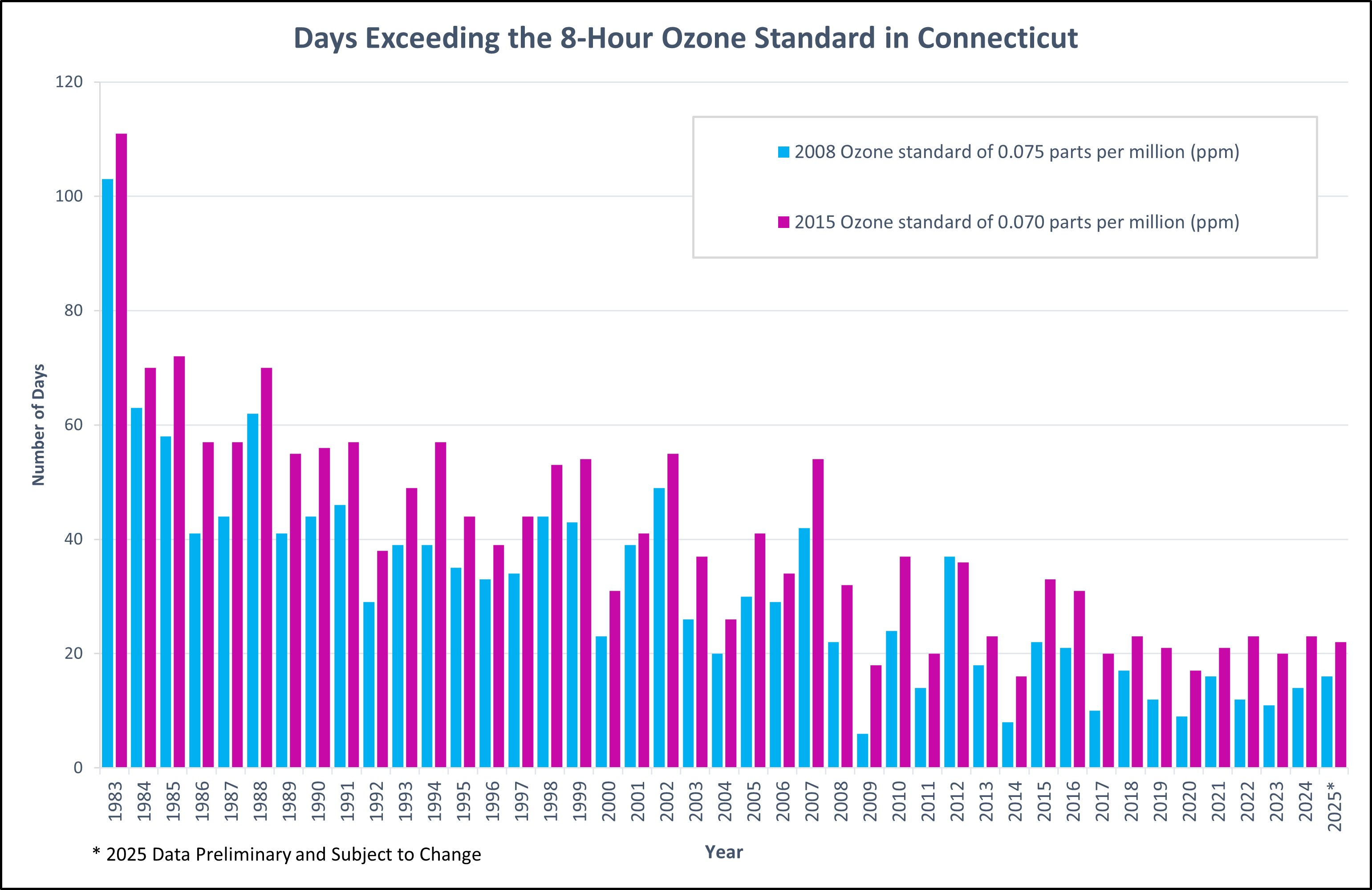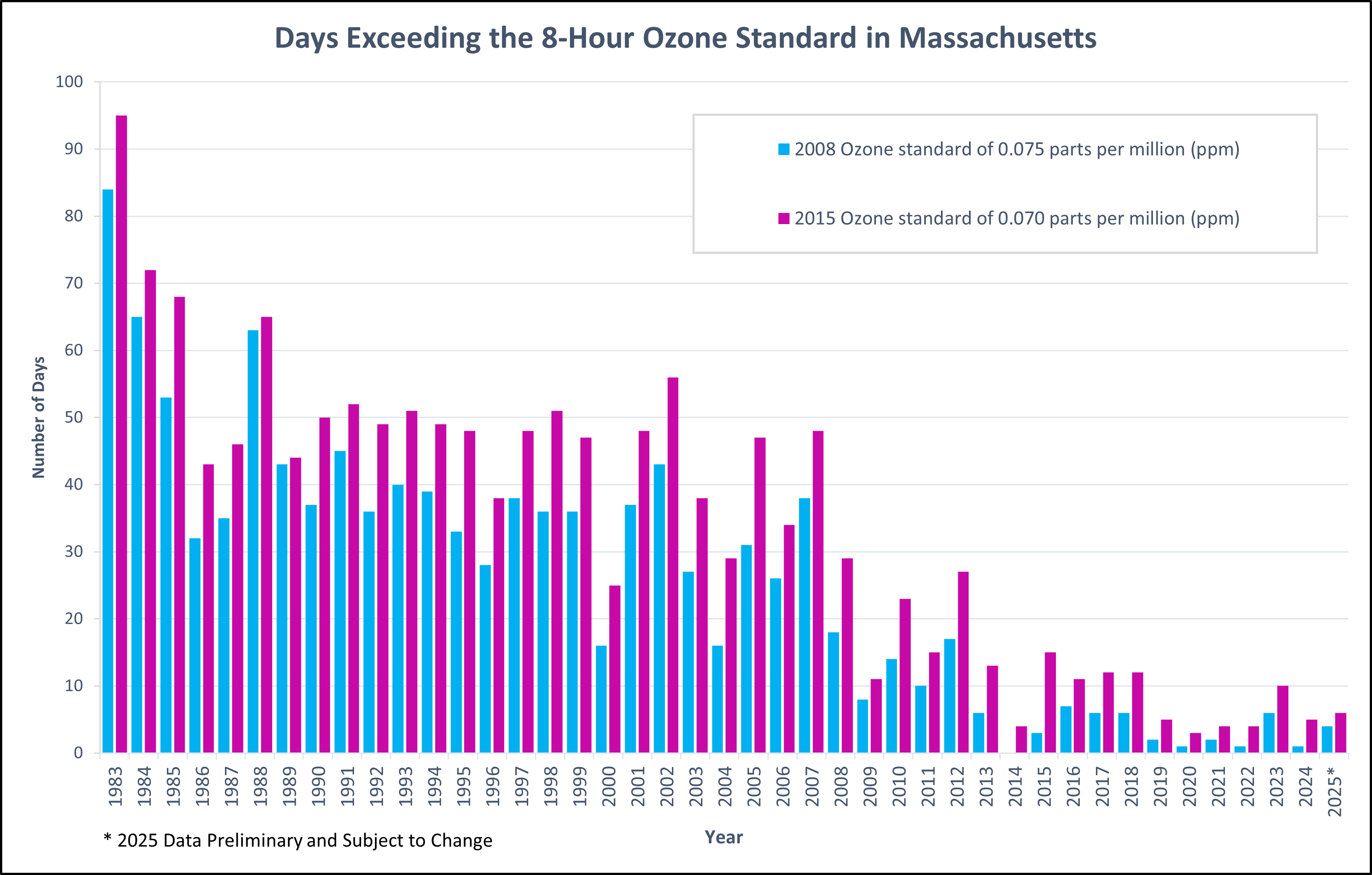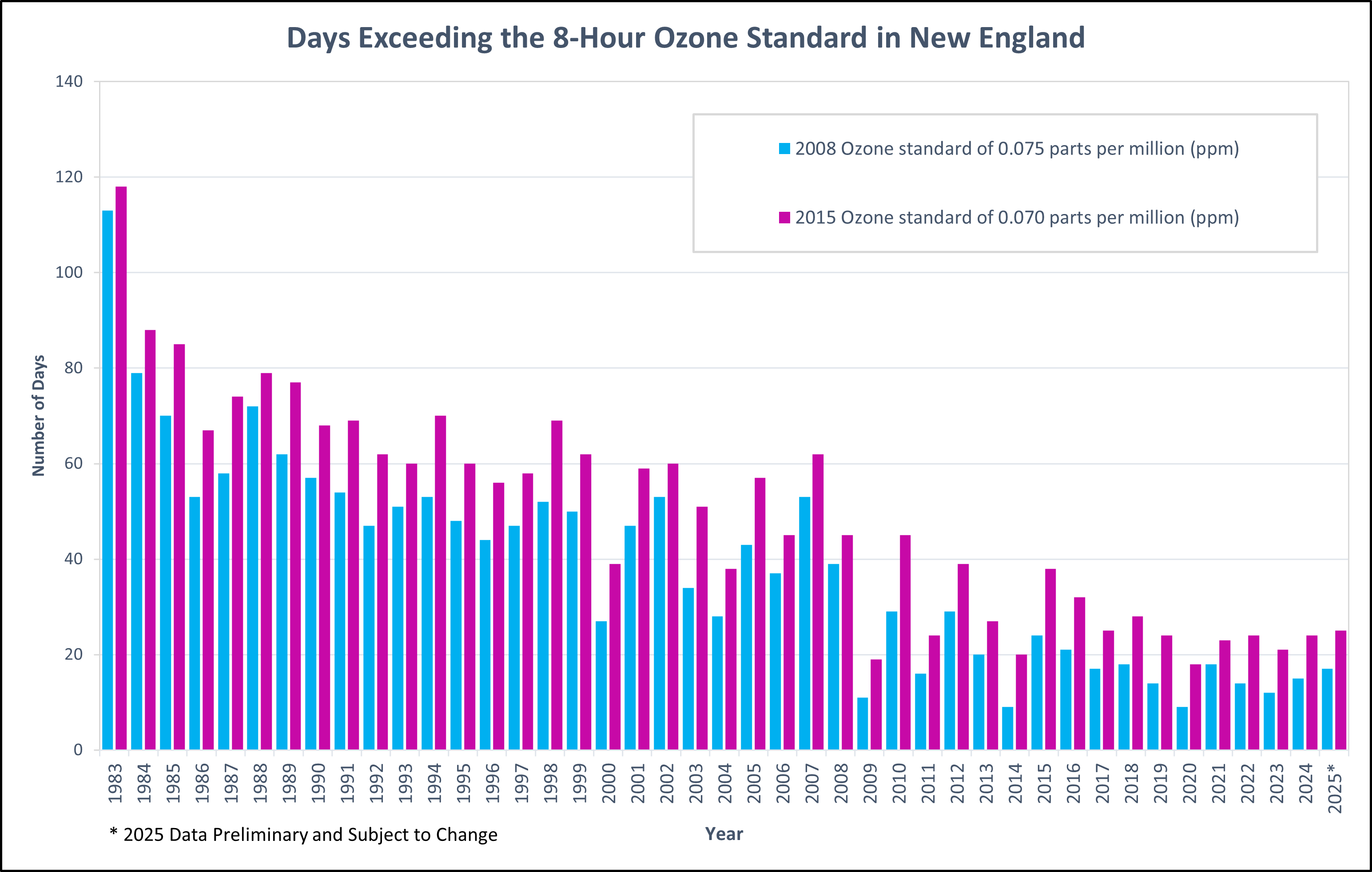 The chart below shows the number of days air quality monitors in each New England state recorded ozone concentrations exceeding the 2008 8-hour ozone standard (that is, days greater than 0.075 parts per million (ppm)), as well as the number of days exceeding the 2015 8-hour ozone standard (that is, days greater than 0.070 ppm).