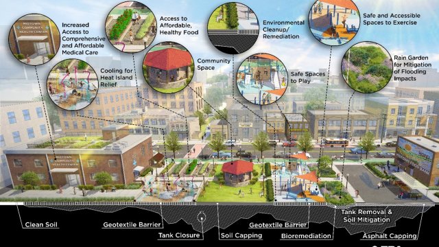 These contaminated buildings are brownfield sites. Free technical assistance or brownfield grants can help communities investigate, assess, clean, and plan safe and resilient reuses. Reuses can reduce over-paved and under-planted spaces and replace dark materials, roofing or pavements that absorb heat and raise nearby temperatures, which otherwise may pose health risks to residents.