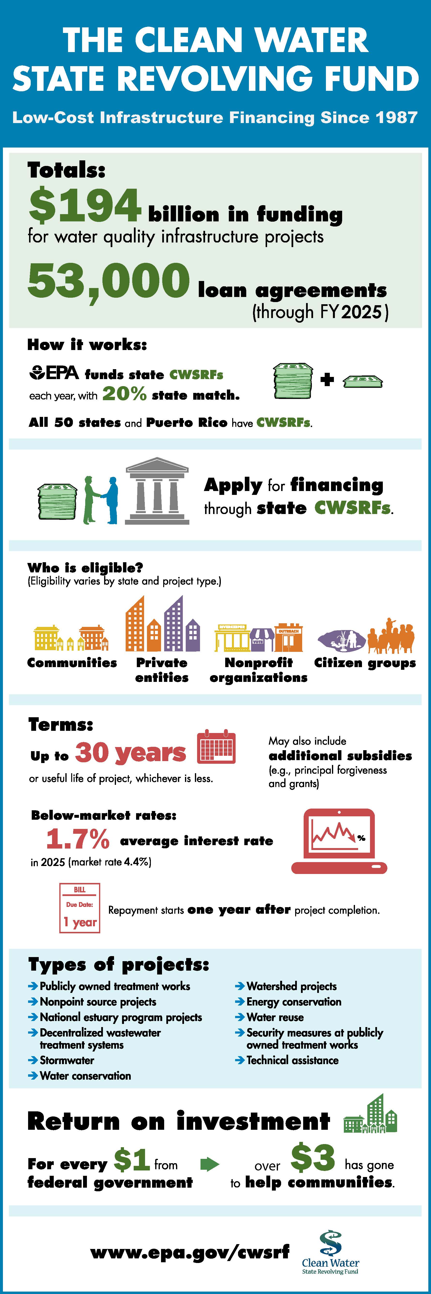 The infographic of the CWSRF program shows total project funding from its inception in 1987 through 2025, number of loans, how the program works, who is eligible for assistance, types of projects funded, and return on federal investment.