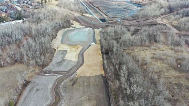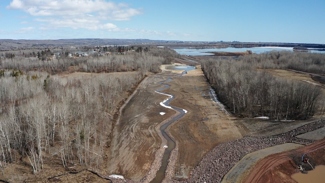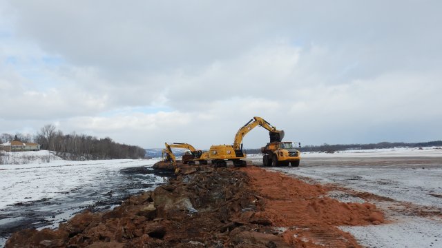 Excavation is performed to connect the new flow path of Unnamed Creek to the Shallow Sheltered Bay now that mechanical dredging in the bay is complete.