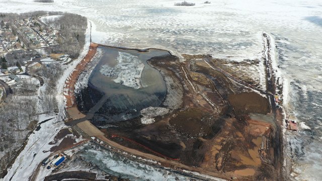 Mechanical dredging has been completed in the Shallow Sheltered Bay, including mechanical removal of the vegetated buffer. A turbidity curtain is in place between the Shallow Sheltered Bay and Spirit Lake to minimize turbidity and water exchange as ice melting occurs with warmer temperatures.