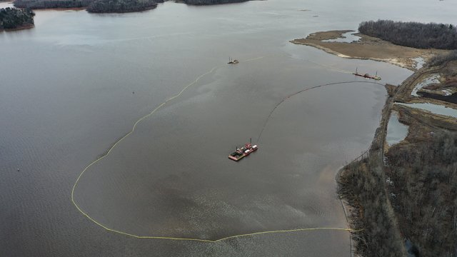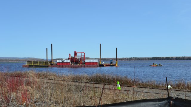 Turbidity curtains are installed in the Wire Mill Delta to prepare for placement of clean capping material.