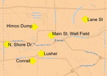 A TCE groundwater plume from industrial operations is near the city’s largest municipal well field. The well field supplies 70 percent of Elkhart’s public drinking water. The site’s potentially responsible parties installed remedies to keep contaminated water from reaching the city well field and clean up contaminated soil. EPA continues monitoring the site and investigating vapor intrusion. Visit the Main Street Well Field webpage for more information.