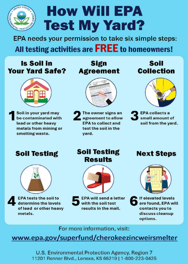 The Chicago Zinc Works Company began smelting zinc in 1872. The company chose Weir as the location, due to nearby commercial coal deposits available to fuel the smelter and the proximity to the Tri-State Mining District. According to historical information, smelting operations closed around 1918 when natural gas wells in other areas of Kansas made smelter operations relying on coal less profitable. The smelting emitted air pollution (soot) containing lead, cadmium, and zinc that deposited on surface soils across the area. Arsenic may also be present from the use of coal power. These contaminants are invisible to the eye in soils. To protect the public from lead hazards and prevent childhood lead poisoning, EPA offers residential yard testing (sampling) and remediation (cleanup) of eligible residential properties.