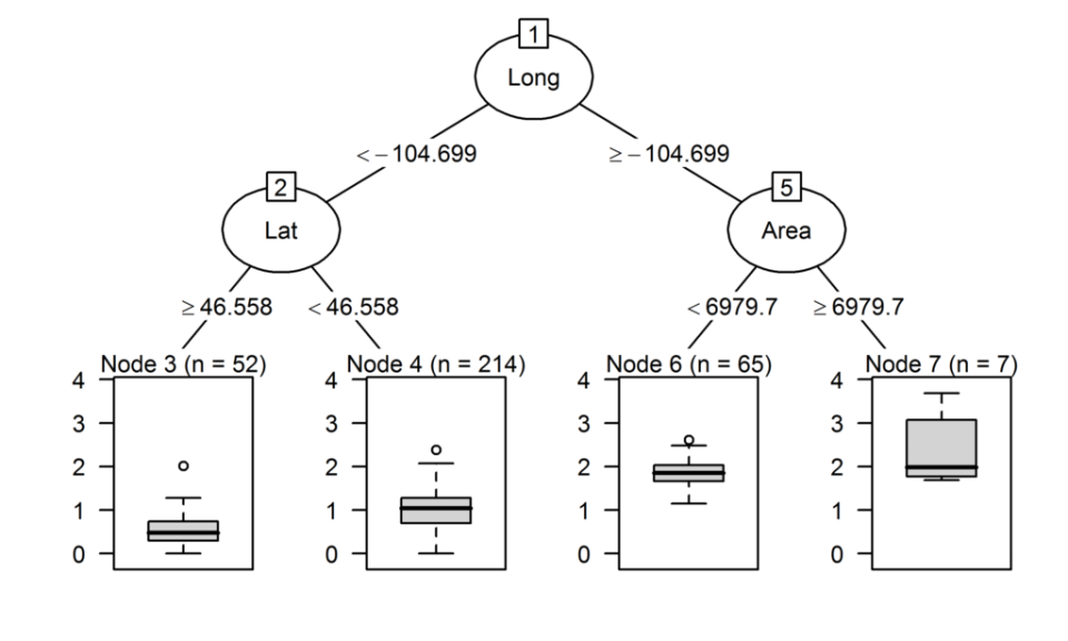 After assembling data on water body characteristics and nutrient concentrations in those water bodies, you can use multivariate statistical analyses such as cluster analysis or classification and regression tree to partition reference water bodies into groups with similar nutrient concentrations. Figure 1 shows the results of analysis in which TP concentrations at reference sites across the conterminous U.S. were modeled using a classification and regression tree with the following predictor variables: catchment area, elevation, longitude, latitude, mean annual temperature, and mean annual precipitation. The regression tree selected the predictor variables that minimized variance in TP concentrations within groups relative to among-group variance. Longitude was the first variable identified in the analysis, splitting the national data into western and eastern groups. Subsequent splits were found for latitude (in western streams) and for catchment area (in eastern streams). Distributions of TP concentrations differ substantially among the groups, with streams in the northwestern U.S. having the lowest concentrations and large streams in the eastern U.S. having the highest concentration.