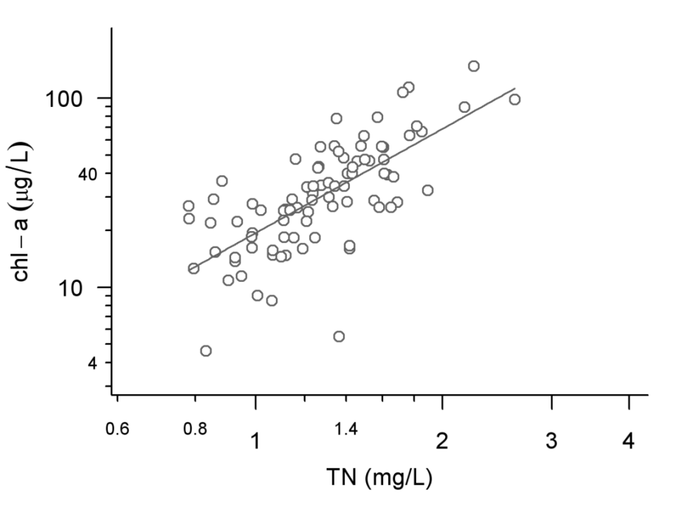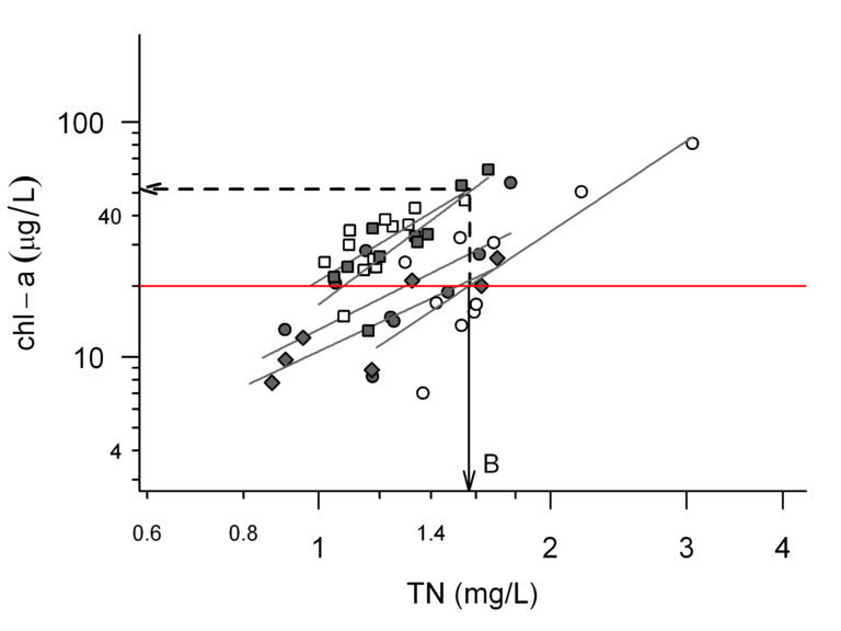 Thoroughly evaluating and documenting the results of the analysis are critical for communicating the results to stakeholders. In the evaluation phase, consider whether the final criterion (and associated stressor-response relationship) is sufficiently precise to inform management decisions. One way to make this determination is to examine the range of possible outcomes associated with a particular criterion value and assess whether the different environmental outcomes are acceptable. In Figure 7, arrow B indicates the TN criterion based on the least sensitive lake. The dashed arrow indicates the prediction of the mean chlorophyll a concentration at the most sensitive lake for this criterion value. So, managing to a mean chlorophyll a concentration of 20 µg/L in the least sensitive lake could result in a mean chlorophyll a concentration of approximately 50 µg/L in the most sensitive lake. Environmental managers might or might not find that range of outcomes acceptable.