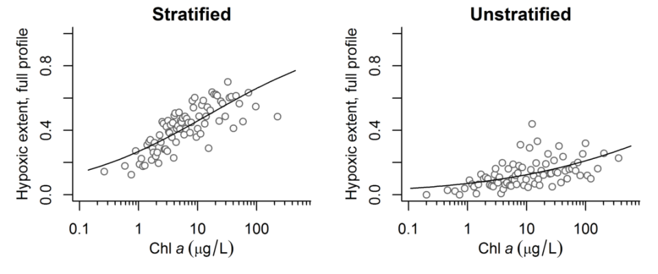 To classify water bodies for stressor-response analysis, you identify groups of water bodies that have similar stressor-response relationships. Relationships estimated within the groups can be more accurate and precise than relationships estimated using the full data set. Classifying water bodies into distinct groups also provides the means to control for the effects of other variables (i.e., candidate classification variables) on the stressor-response relationship of interest while still allowing for relatively simple models that simulate the response as a function of stressor levels. For example, the coplot of hypoxic extent versus chlorophyll a concentration indicates that the stratification status of a lake strongly influences the slope of the relationships between chlorophyll a and hypoxic extent. This finding suggests that lakes should be classified by stratification status prior to stressor-response modeling. In this case, classification controls for the effect of the stratification and improves the precision of the resulting stressor-response relationships (see Figure 4).