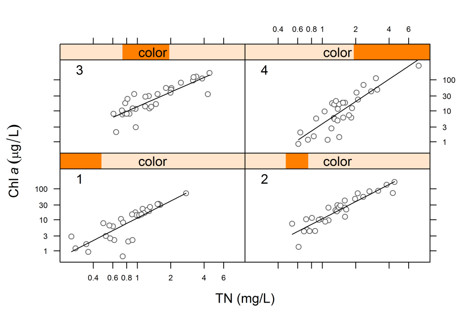 An enhancement of scatter plots in which data are first grouped with respect to a third variable, then scatter plots are examined within groups (see Figure 3). This technique is particularly useful for examining the potential effect of different classification variables on the relationship between stressor and response variables.