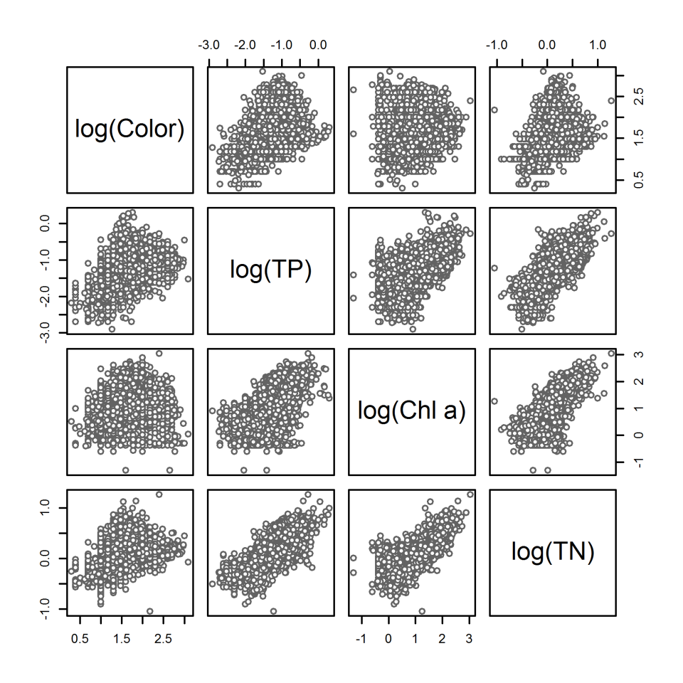 - Data summaries: Examining means, standard deviations, ranges, and quartiles of different variables can help identify outliers and suggest appropriate variable transformation. For example, measurements for nutrients such as TN or TP often need to be log-transformed to reduce the skewness in their distributions.