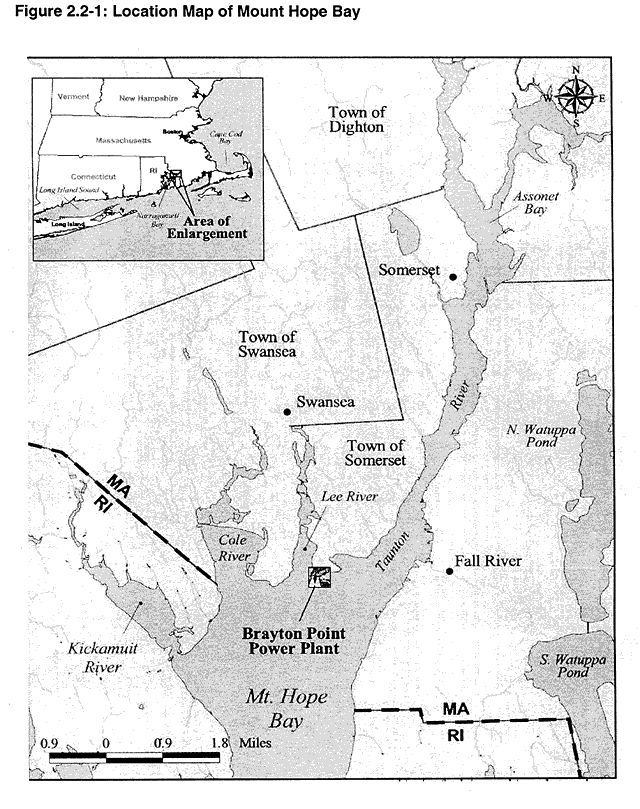 The Brayton Point Station power plant, located on the shores of Mount Hope Bay, is the largest fossil-fuel burning power plant in New England. Mount Hope Bay expands to both Massachusetts and Rhode Island waters and provides important spawning, nursery and migratory habitat for many species of fish and is a key segment of the Narragansett Bay estuary, a designated estuary of national significance under the Clean Water Act (CWA). Brayton Point Station is owned and operated by Dominion Energy.