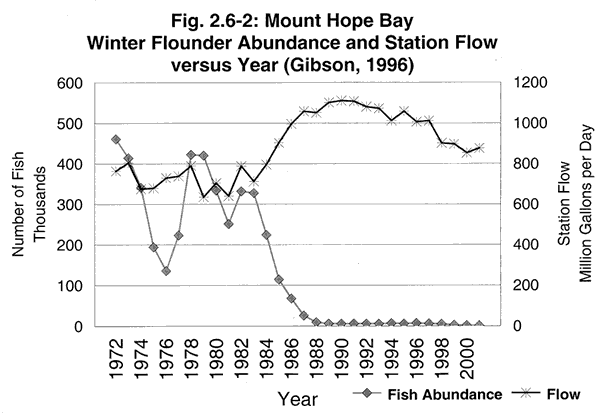 - Figure 2.6-2: Mount Hope Bay Winter Flounder Abundance and Station Flow versus Year