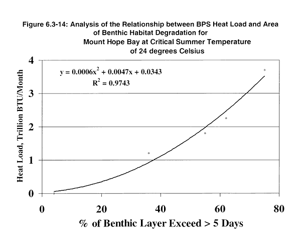- Figure 6.3-14: Analysis of the Relationship between BPS Heat Load and Area of Benthic Habitat Degradation for Mount Hope Bay at Critical Summer Temperature of 24 degrees Celsius