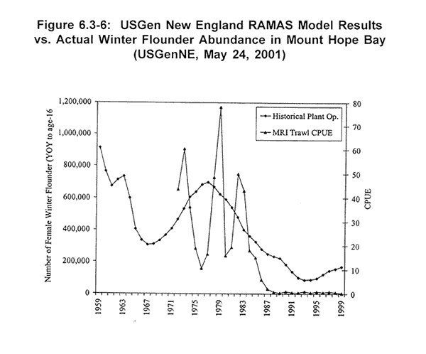 - Figure 6.3-6: USGen New England RAMAS Model Results vs. Actual Winter Flounder Abundance in Mount Hope Bay