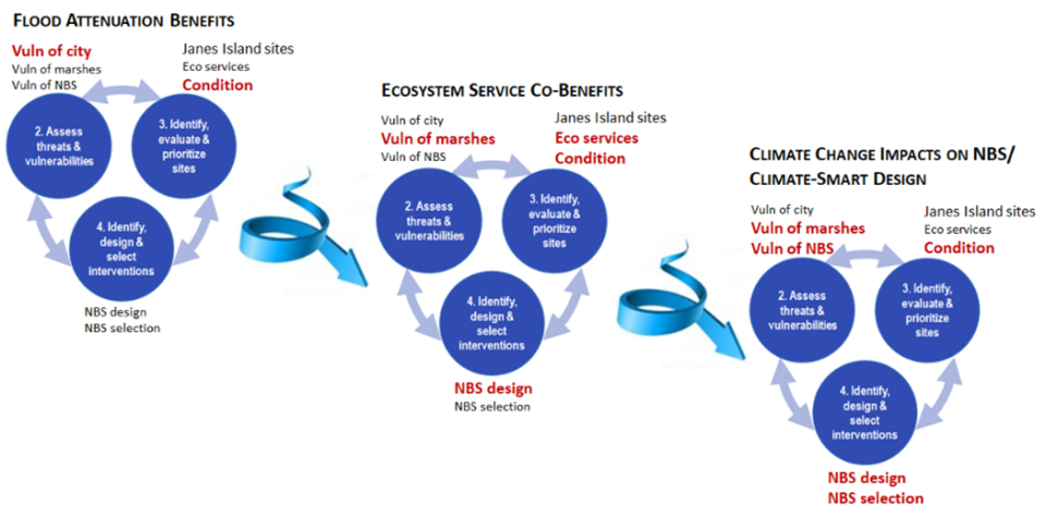 The analysis focused on a hypothetical Janes Island marsh restoration project as an example. Discussions were organized around three themes (Figure 3 ) that reflected the iterative nature of the planning triad. The first theme centered on flood attenuation, examining the vulnerability of the city to flooding based on the current condition of existing salt marshes. This was followed by a second thematic iteration, which examined other social and economic ("ecosystem service") co-benefits in terms of how vulnerabilities of marshes to ongoing environmental changes may affect marsh condition and thus their ability to provide co-benefits, and what that might mean for NBS design. Finally, the third thematic iteration assessed how vulnerabilities to long-term future impacts of ongoing environmental changes would likely affect the condition of marshes underlying NBS projects, and the implications of that for selection and design of NBS for long term resilience. For each theme, research presentations and group discussions were used to develop draft timelines for associated research components.
