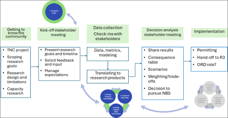 - Develop community engagement strategies for research co-production on goal setting, regular feedback on methods and preliminary results for incorporation into next steps, and decision support information for evaluating NBS options to implement.