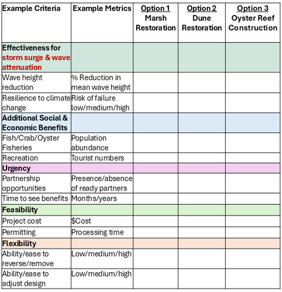 The workshop results from this Organon partner project were used as a springboard for the SDR team’s subsequent iterations of research combined with regular community engagement. The aim was to ensure robust EPA-Crisfield co-production to analyze which NBS options have the greatest potential to serve the resilience needs of the community; assess NBS trade-offs in terms of effectiveness for coastal resilience, other co-benefits, project feasibility, etc.; and structure decision making around selection of priority NBS for implementation. To start this process, stakeholder meetings (April 2024) were held to present preliminary results of the integrated research along with the evaluation framework (Table 1). This afforded community members and local technical experts the opportunity to provide feedback and participate in co-production of research next steps. For full details on these meetings and their results, see the EPA report, Supporting Coastal Community Resilience through Natural Infrastructure.
