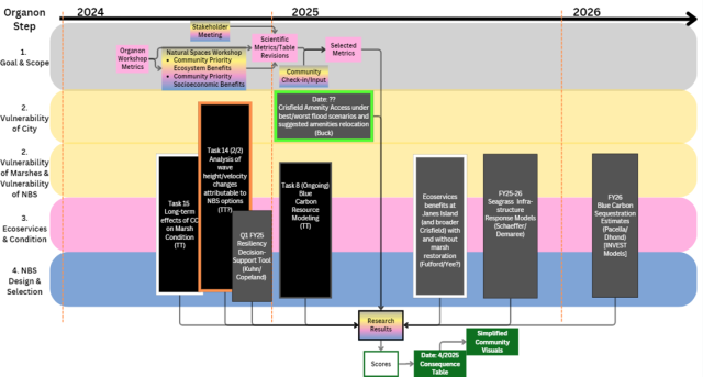 The Workshop 1 analysis of the team’s research components, assessing coverage within and across steps of the planning triad (steps 2-4), helped the participating researchers orient to when and how to best share and integrate their research results to inform a holistic assessment of NBS design options for the Crisfield community. Timelines developed for each theme (e.g., Figure 4) laid out a temporal flow of how each component would contribute to one or more steps, how components would connect, and decision points for tailoring results. The timelines also identified synthesis endpoints that would become the ultimate output products for the community. These specifics were the basis for revising individual research group timelines within each theme, establishing inter-group coordination that was previously missing, and focusing output formats to be more directly responsive to research aspects within each Organon step (e.g., assess vulnerabilities, evaluate site conditions, select NBS). Discussions during the workshop were used to develop checklists for later knowledge exchange among the thematic teams and for further aligning research outputs with community needs.