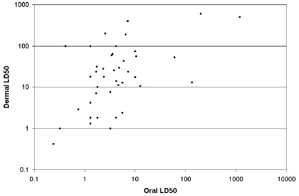Regression analysis was used to predict the dermal LD50 based on the oral LD50. In addition, pesticide chemical properties were included into the regression model in an attempt to improve the model fit, similar to the approach taken by Mineau (2002). Prior to regression analysis, the dermal LD50 data and the oral LD50 data to were transformed to the log-base10 scale to better meet assumptions of normality and homogeneous variance.