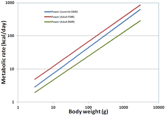 The following table compares allometric relationships for three generic body weights. The juvenile peak DME ranges from 1.6 to 2.1 times the BMR. Figure F1 shows the juvenile DME trends between adult BMR and FMR across the full range of body weights.