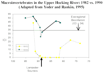 By reviewing bioassessment data collected over time, the Ohio EPA has been able to demonstrate improved stream quality as a result of actions taken to reduce pollutant loadings. This has been done for individual river systems, as well as on a statewide basis. For example, the upper Hocking River has historically been one of the most polluted rivers in the state, with significant impacts by industrial and municipal effluents as well as combined sewer overflows. Studies indicated serious degradation for 20 miles downstream of the Lancaster WWTP, with an average macroinvertebrate ICI score in 1982 of only 6.9. Treatment plant upgrades, including the addition of a pretreatment program to remove metals, resulted in substantially improved water quality, as indicated by an average ICI score of 42 in 1990 for the same stretch of river. Similar improvements to the fish community were observed, as indicated by changes in the IBI and MIwb.